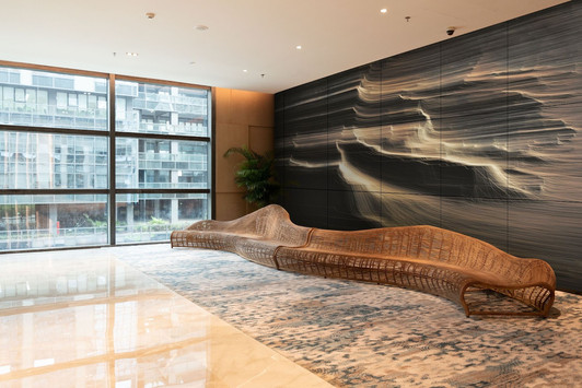 Giving the wall a third dimension, a sculptural feature wall advances a room’s traditional, flat four walls to something far more dynamic. The pictured sculptural wall art, by an artist featured in our Artist Walls collection, is inspired by the fluid rhythms of nature, contributing to a calm and composed office environment. It harnesses the delicate quality of the ceramic medium to elicit this atmosphere, but wall sculptures can be diverse in style and effect, using media such as metal, textile, wood or glass — and beyond!