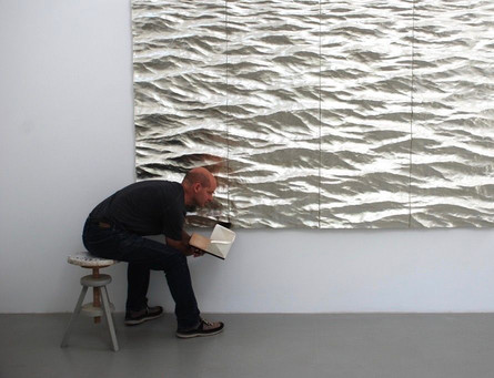 A textured feature wall can craft a surface that is more natural and organic; with this design an office space may become less industrial and more welcoming. This gilded wall maps the undulating flow of the ocean, evoking composure and calm upon its viewer. This a unique way to create an accent wall, with the artist’s use of textured panelling allowing for an expansive and impactful work. See more work from this artist in our Artist Walls collection.