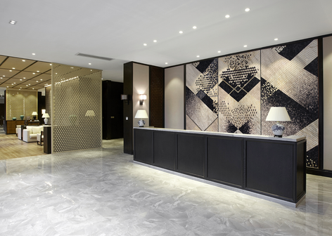 Tiled feature walls are intricately designed and hugely impactful when installed at large scale. Mosaic design options are broad, from a regular, geometric pattern to illustrative renders of figures and landscapes. The feature wall pictured, using mosaic wall tiles, is detailed and well-organised, illustrating many of the qualities important to an effective office environment.