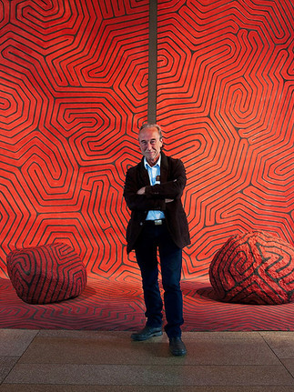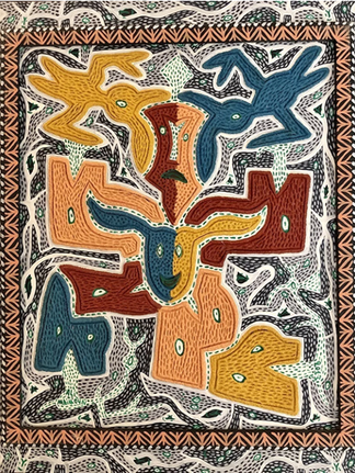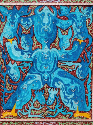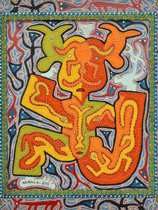 For Moroccan artist Ali Maimoun (b. 1956), creating art is a deeply ritualistic process, a journey into his African heritage. Originally trained as a stonemason, Maimoun's mystical paintings burst with vivid colour, displaying a unique style that is highly detailed and decorative. His works, crafted from sawdust, seem to leap outward from the canvas as if the Nazca lines have come to life in a divergent, dreamlike realm.