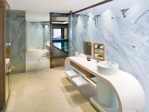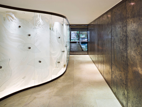 Another creative way in which to use glass in spa interior design is to take advantage of glass’ translucent properties to create wall partitions with an artwork. The spa interior is made more uplifting as light is allowed to flow through the space, rather than being divided by opaque walls. As the glass spa artwork is used as a wall, it creates an immersive atmosphere which transports the spa visitors to an otherworldly space.