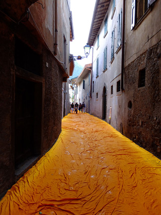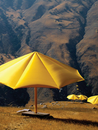 Left to right: Christo and Jean-Claude, The Umbrellas (1991) in Japan (Ibaraki) and the USA (California), The Floating Piers (2016) in Lake Iseo near Brescia, Italy, yellow fabric public art installation