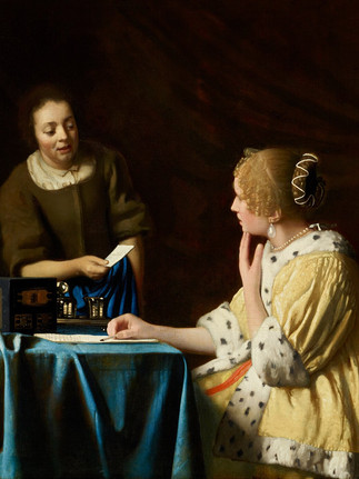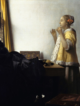 Left to right: Johannes Vermeer, Woman with a Pearl Necklace (1664), A Lady Writing (1665), Lady with Her Maidservant Holding a Letter (1666), Oil on canvas