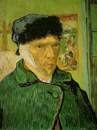 Left to right: Vincent Van Gogh, The Yellow House (1888), The Harvest (1888), Self Portrait with Bandaged Ear (1889), Oil on canvas
