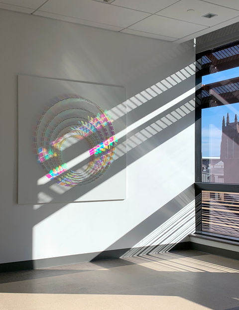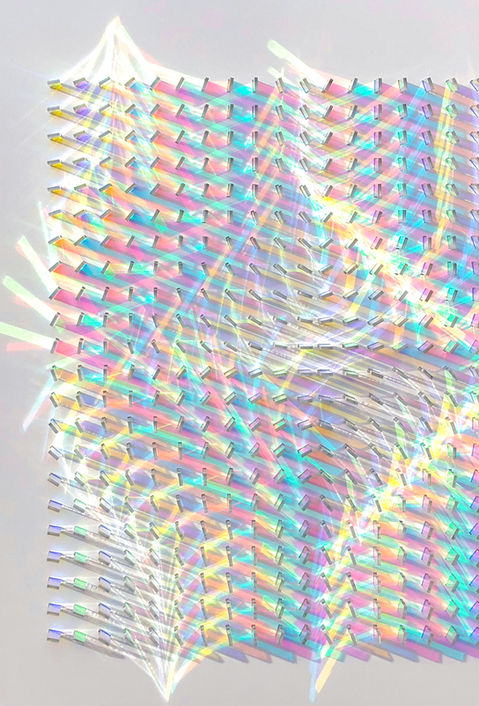 Working with the intangible medium of light, Wood orchestrates a range of high and low-tech optical materials to harness patterns of light that suggest ephemeral glimpsed moments in the natural world.