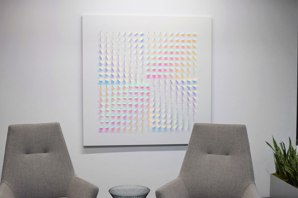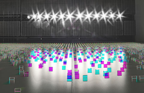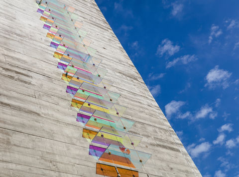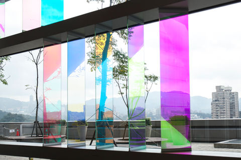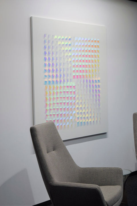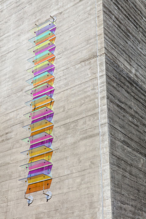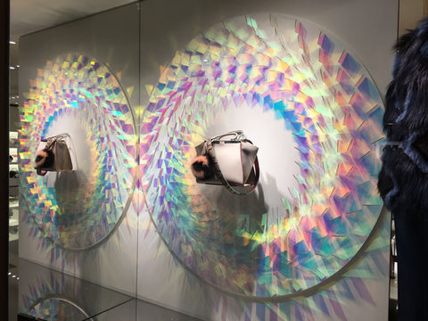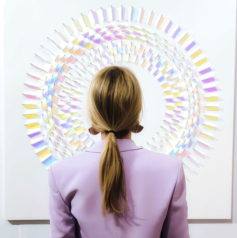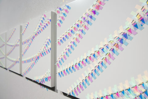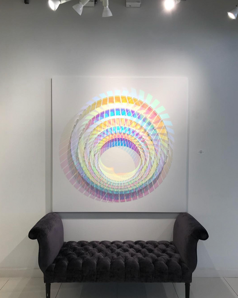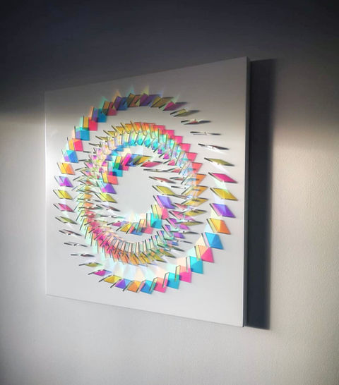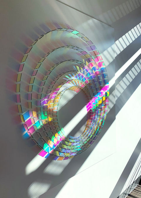 Wood’s practice is primarily concerned with the medium of dichroic glass, which was originally developed by NASA space agency as a colourless material that filters and reflects wavelengths of light producing a spectrum of rainbow coloured shadows and projections.