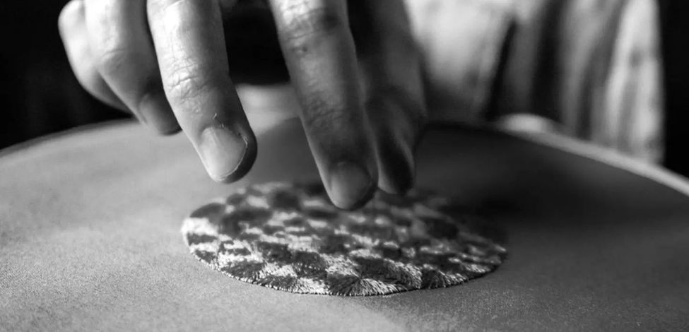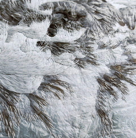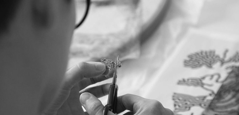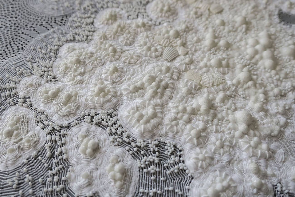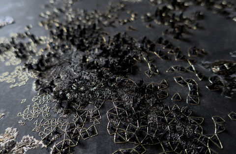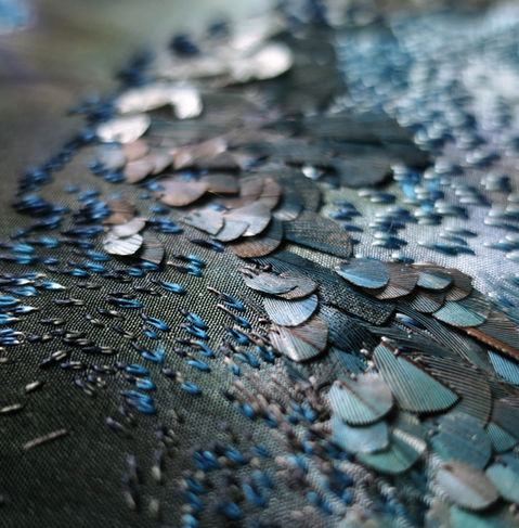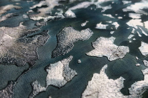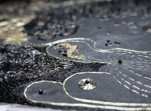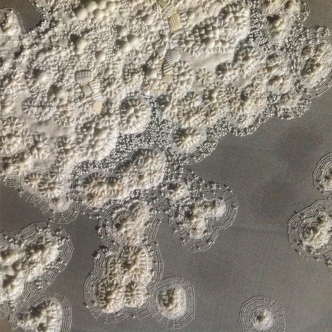 Brandibas re-invents needlepoint embroidery as an expressive and poetic medium, developing a range of delicate techniques: from her painterly use of dying fabrics, through to the creative fine needlework of the embroidery itself.