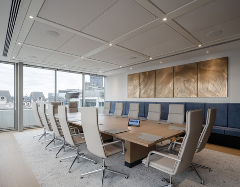 Artelier provided wall artworks for 11 meeting rooms, seeking to respond to the uses of each meeting space and give each one a unique character. One of the artists used in the meeting rooms explores the concept of 'hidden cities' – he abstracts the forms of urban architecture and overlays them, giving a flavour of Cubism by simultaneously presenting multiple viewpoints. Exploring the textures of paint, the artist builds up layers on the surface, giving the paintings a tactile quality.
