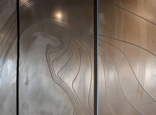 Bronze is a timeless material that is inherently elegant, and connects to a sense of heritage. The abstract composition of the panels, however, brings a contemporary edge to the classical material of bronze. Together, the cast bronze panels seem to create forms a composition that evokes the contours of a landscape – this particular piece was inspired by the Thames River Estuary. Throughout the project, connecting to the natural aspects of the city was important, in order to bring a sense of calm to the corporate art collection. The generous windows of the space bathe the artwork in natural light, giving it a reflective quality that seems to glow.