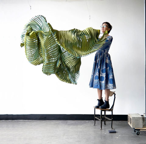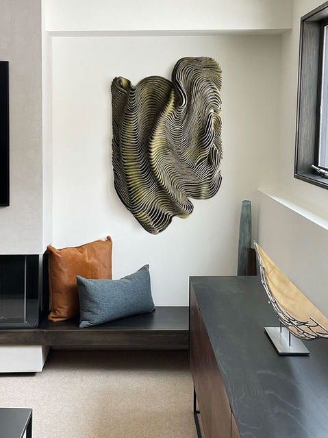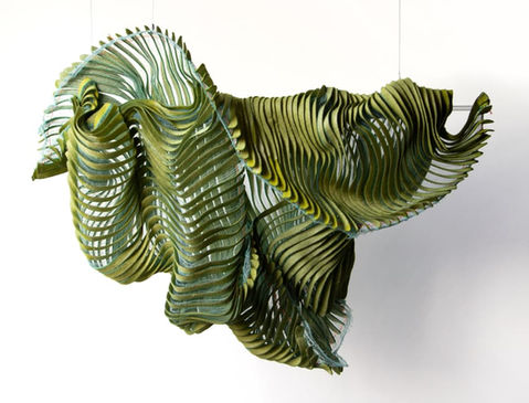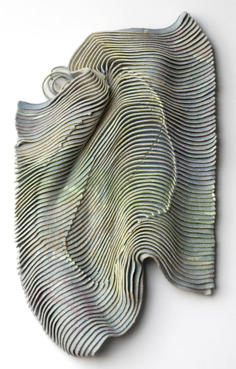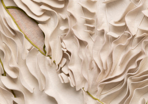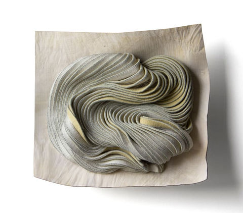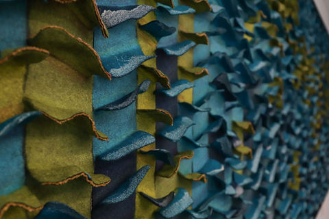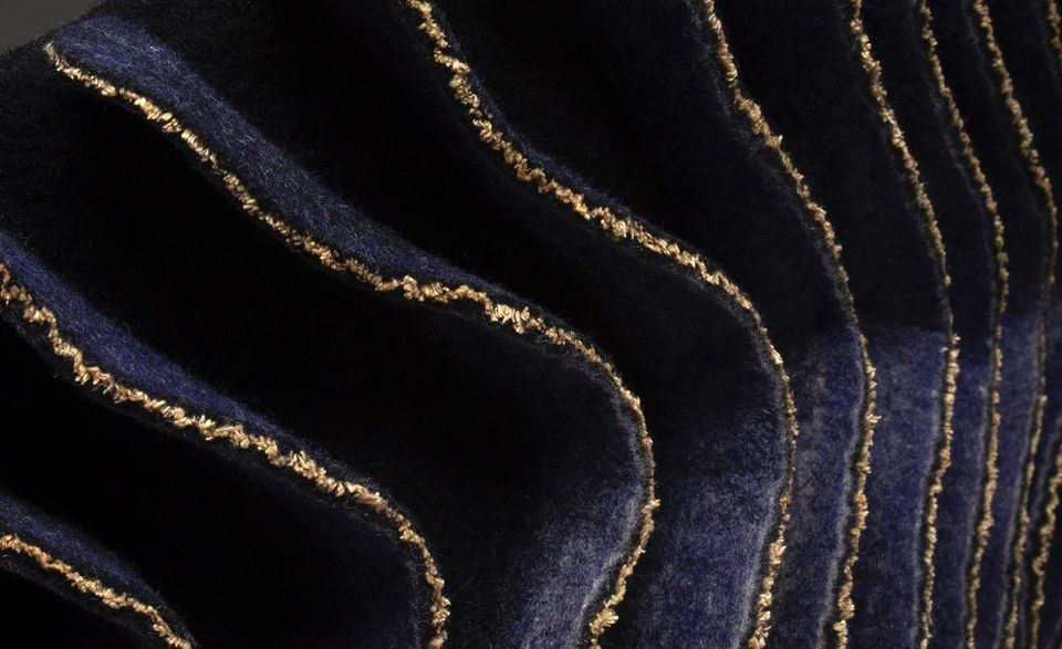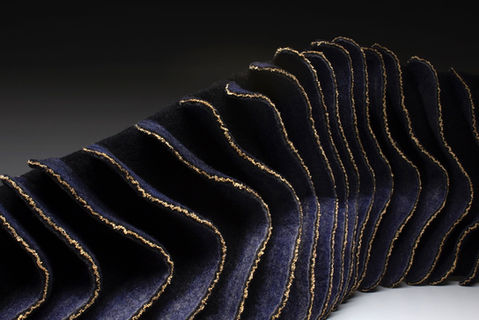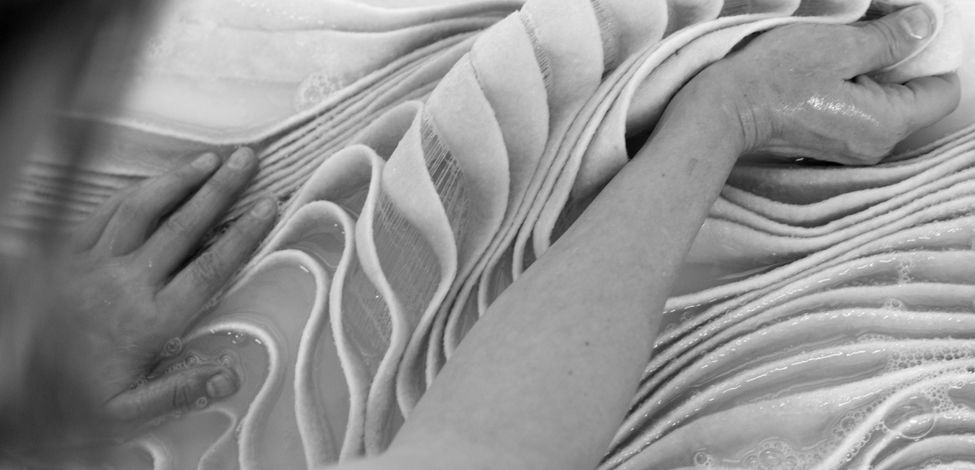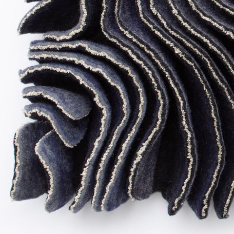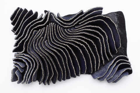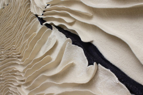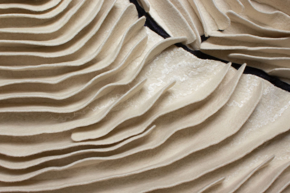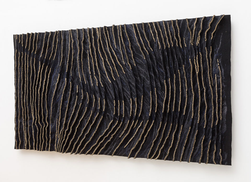 Kún's practice explores the transformation of wool, as tufts of fibre shape into limitless sculptural forms through the energy of her hands. The tactility of the making process is translated into the sensual depth of her undulating compositions. This novel approach to constructing and mounting ribs of felt innovates an ancient craft.