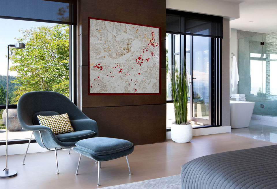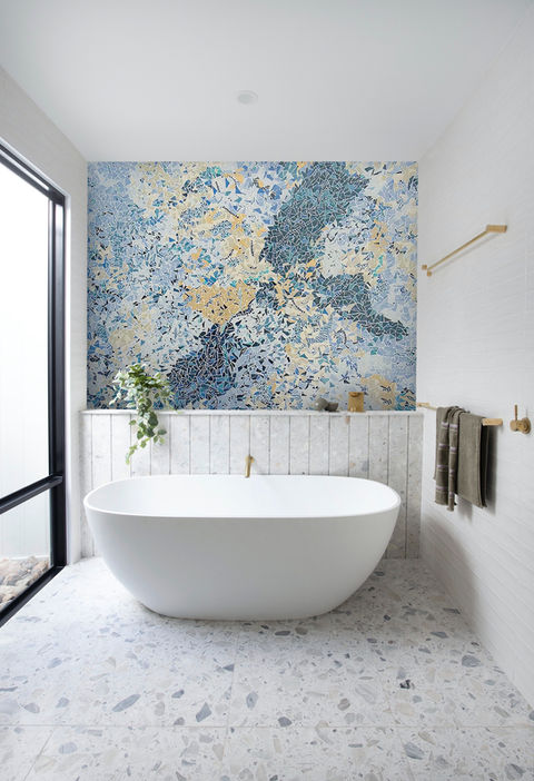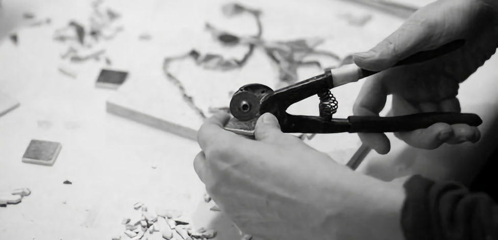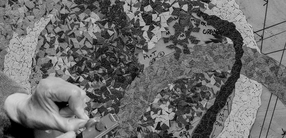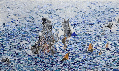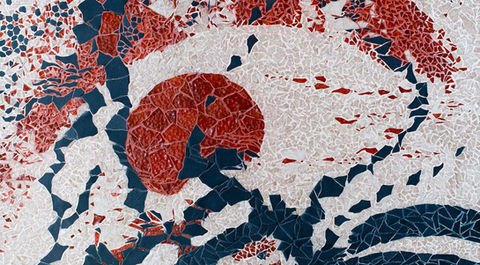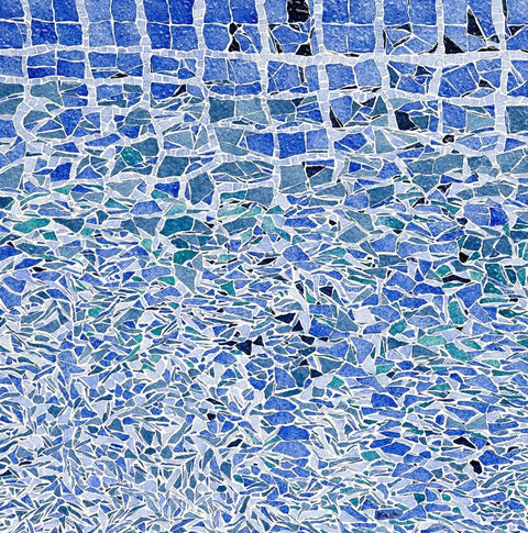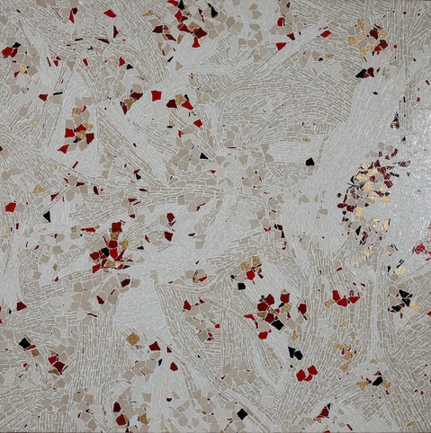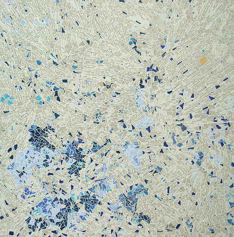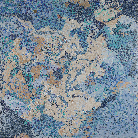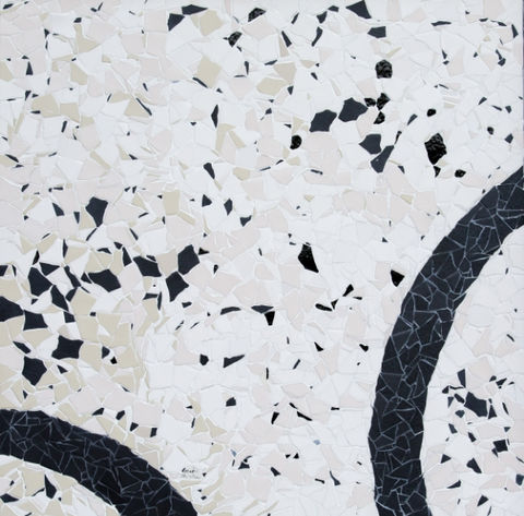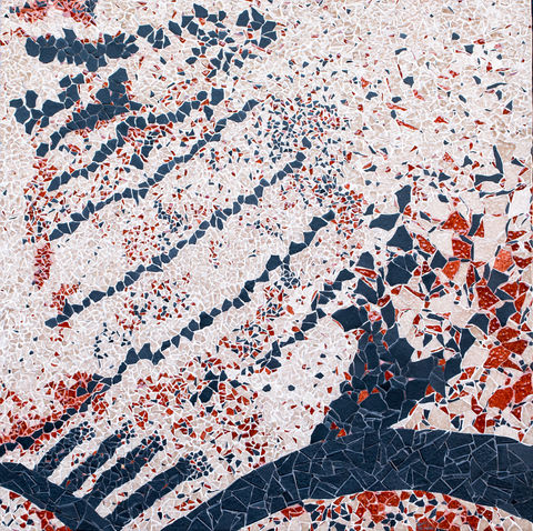 Each mosaic piece is carefully hand-cut to a unique organic shape and applied to the artwork’s surface like the gesture of a brushstroke, and as the piece evolves the imagery emerges like an impressionist painting.