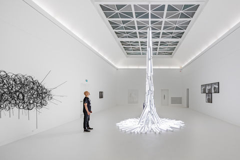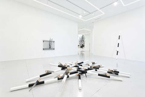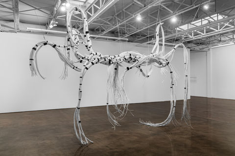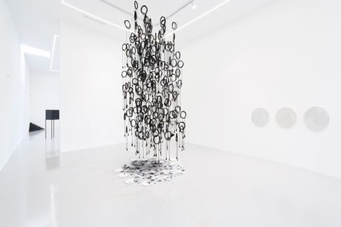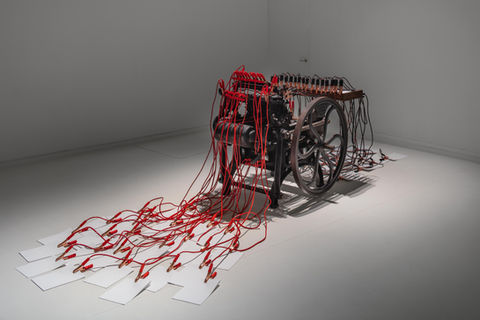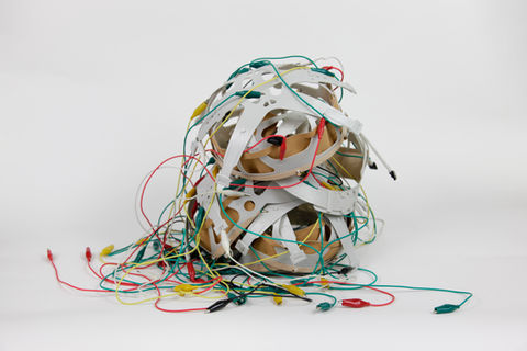 By using materials such as antenna cable, typewriters and VHS tapes, Mounir Fatmi elaborates an experimental archeology that questions the world and the role of the artist in a society in crisis. He twists its codes and precepts through the prism of a trinity comprising Language, Architecture and Machine. Thus, he questions the limits of language and communication while reflecting upon these obsolescent materials and their uncertain future.