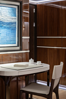 The interior is finished to an exquisitely high calibre, and this sophistication was integral to the curation on board. Heesen Yachts describe how "Lusine is one of the most complex interiors ever crafted by the artisans of Heesen Yachts Interiors, who enjoyed the challenge of working with rare woods, precious fabrics and exquisite leathers" (quoted from Heesen Yachts). Each artwork was therefore uniquely created by artists specifically for the yacht, coming together into a coherent and collectable art selection.