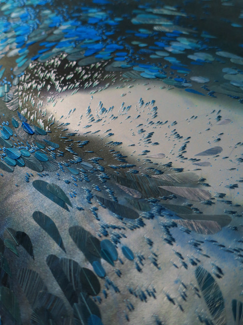 Individual threads and feather details have been embroidered into fine, shimmering silk, giving the piece a mesmerising quality.