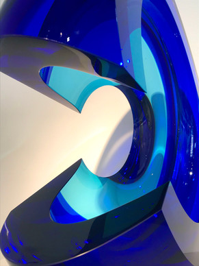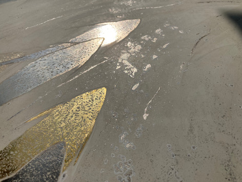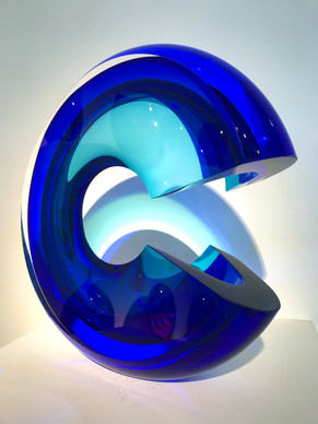 The artist works with fused glass, trapping bubbles of air inside. The result is reminiscent of glassy waters, revealing rocks and marine life underneath the sea's surface. Each glass element therefore becomes like a microcosm, that captures the experience of staring into the depths of the sea.