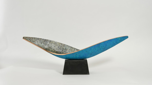 Sculptural works provided further accents throughout the space, such as this bronze sculpture with sea-green and verdigris blue patinas. It reflects a key inspiration behind the exterior yacht design – the bird's wing – bringing the interior and exterior together through subtle visual language.