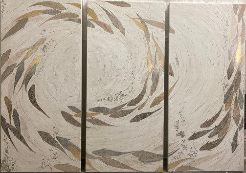 The stairwell's sweeping curves are accentuated by a gold leaf triptych, with a swirling fish composition. The artwork was executed by a master gilding artist, who worked with a variety of precious metals to achieve a shimmering, complex surface.