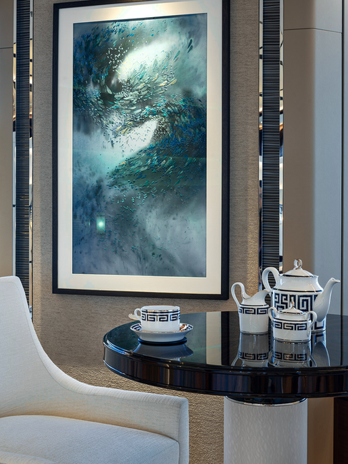 Flanking each side of the salon are a pair of contemporary wave sculptures, which are hand-made from optical glass.
